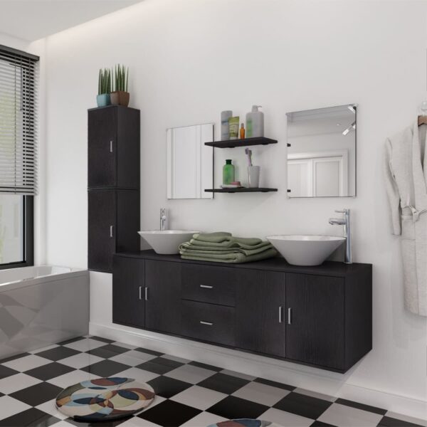 Questo set completo, composto da 1 armadio a muro con lavabo, 2 armadietti a muro, 2 specchi, 2 scaffali, 2 lavandini, sarà un ottimo accessorio per il vostro bagno, ottimizzando lo spazio senza compromettere lo stile.