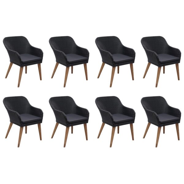 Il tavolo da pranzo è realizzato in legno massello di acacia con finitura a olio, ed è robusto, resistente e di facile manutenzione. Caratterizzate da un telaio in acciaio verniciato a polvere rivestito in rattan PE resistente agli agenti atmosferici, queste sedie da pranzo sono solide e facili da pulire. Le sedie dalla forma ergonomica includono un cuscino dalla spessa imbottitura, che fornisce ulteriore comodità quando ci si vuole rilassare. Le federe dei cuscini sono in poliestere e possono essere rimosse con facilità per essere lavate.