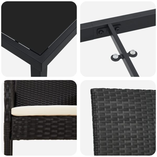 Questo set di sedie da giardino aggiunge un tocco elegante al tuo patio o terrazza, portando stile e comfort ai tuoi pasti all’aperto. Fatto in rattan polietilene di qualità, il design nero elegante si integra perfettamente con il tuo arredamento esterno e offre un’ottima opzione di seduta per riunioni di famiglia o serate tranquille in giardino.