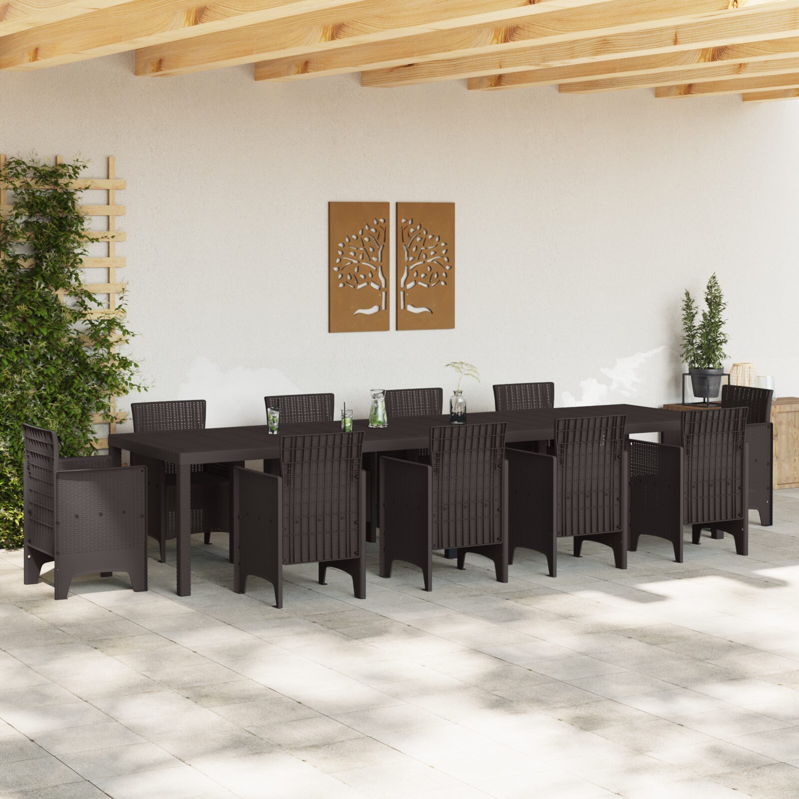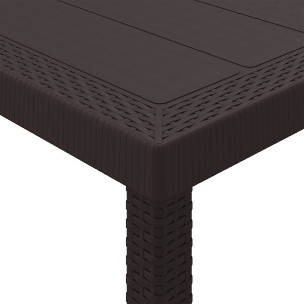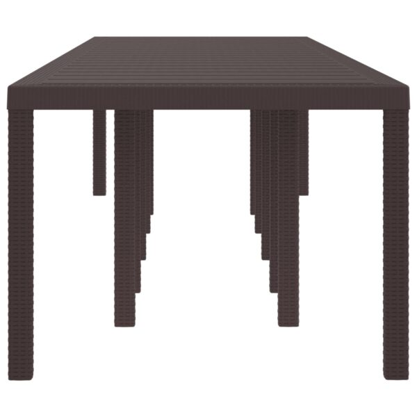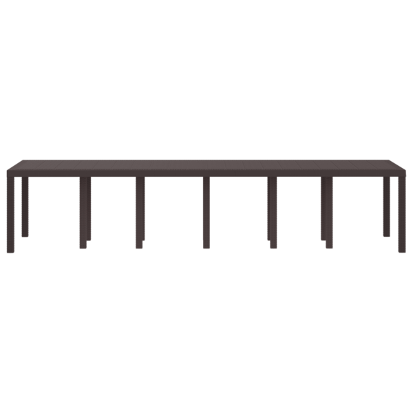 Questo elegante tavolo da pranzo all’aperto è fatto in robusto polipropilene e ha una chic finitura marrone opaca che migliora il tuo spazio esterno. Con un’ottima dimensione di 350 x 100 cm, offre ampio spazio per i raduni, combinando funzionalità e stile moderno.